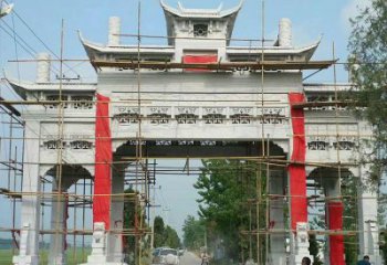 棠樾牌坊群是樹立在村外的原野上的,一望平川間拔地而起,四柱朝天,像一隊接受檢閱的士兵,仿古牌坊雕塑鮮明而強烈。青石仿古牌坊雕塑可以隨意地在它的周圍活動,甚至坐在那青石基座上休息、讀報、做小買賣。青石仿古石雕村口牌坊雕塑似乎已經(jīng)成為南閤村全村人日常生活場景的一部分。